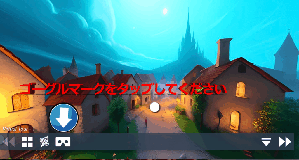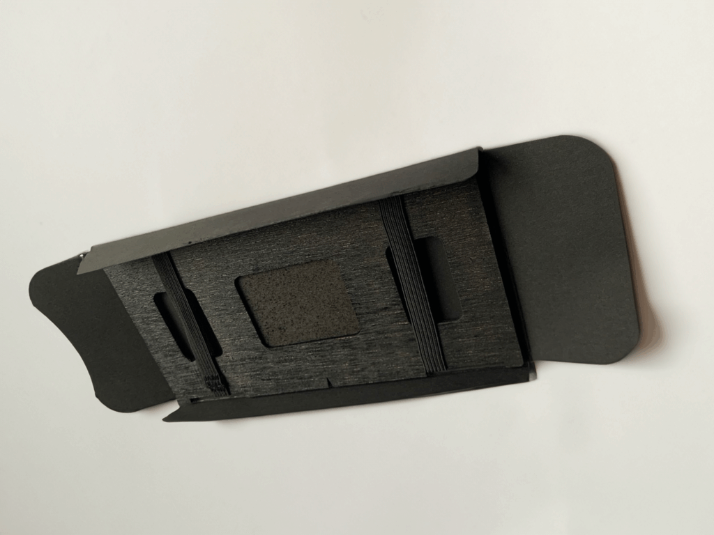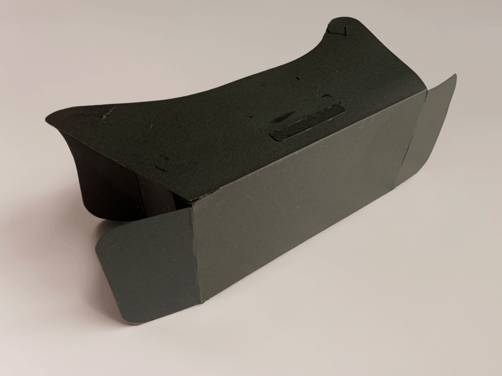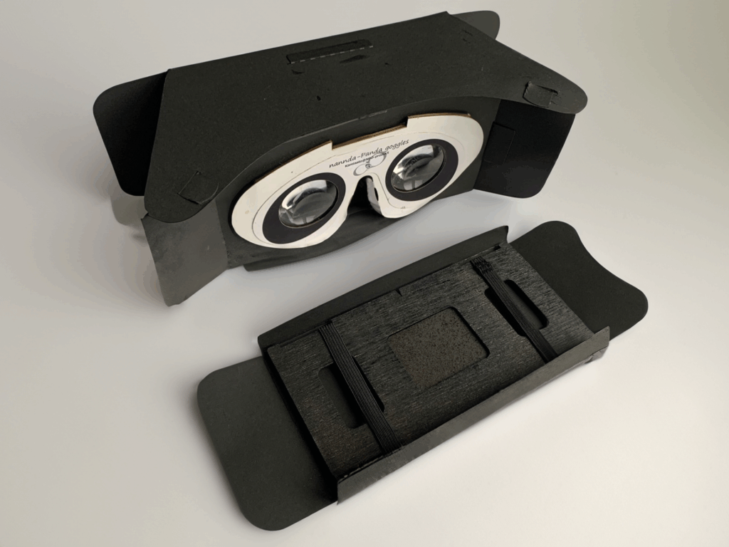 ペーパークラフトゴーグルの背面の所定の位置にスマートフォンを挟み込み取り付けのゴムに挟んでご利用ください